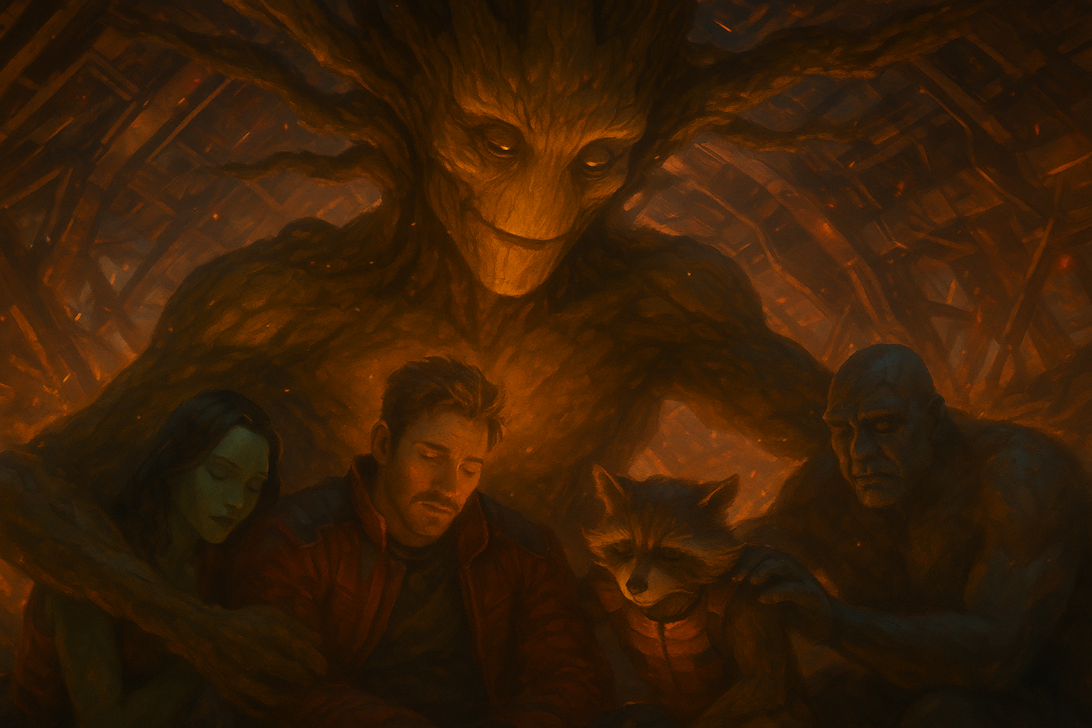 가디언즈 오브 갤럭시는 PG-13 등급이지만 과도한 폭력과 선정성 대신 ‘불량하지만 착한’ 유머를 선택한다. 피터와 가모라의 로맨스는 키스 대신 헤드폰 공유로 표현되고, 로켓의 분노는 친구를 지키려는 애정에서 출발한다. 부모 세대는 70년대 팝송에 향수를 느끼고, 자녀 세대는 털복숭이 너구리와 단 한마디 “I am Groot”만 반복하는 나무의 귀여움에 빠진다. 세대별 포인트가 다르기에 거실 리모컨 싸움 없이 온 가족 시청이 가능하다. 또한 서사는 ‘선택받은 영웅’이 아니라 ‘상처 입은 사람들’이 서로를 보듬으며 만들어 가는 ‘선택한 가족’을 강조한다. 혈연이 아닌 유대감을 중심에 둔 이 메시지는 재혼·입양·다문화 가정이 늘어난 현대 한국 사회와도 자연스럽게 호응한다. 피터가 마지막에 강력한 인피니티 스톤의 힘을 견디며 살아남을 수 있었던 것은 그루트가 나무 팔로 안아 주고, 로켓·가모라·드랙스가 손을 맞잡아 함께 버텼기 때문이다. 이는 가족이라는 안전망이 존재할 때 개인이 성장하고 세계를 구할 힘을 얻는다는 은유적인 선언이다. 자칫 무겁게 들릴 수 있는 이 주제를 제임스 건은 ‘뻔뻔한 감동’으로 풀어낸다. 그루트가 “We are Groot”라고 말하며 희생하는 장면 직후, 로켓이 잔해 속 묘목을 살뜰히 품에 안고 돌아서는 컷으로 분위기를 전환하는 식이다.